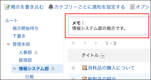 カテゴリーの説明を入力します。設定すると、カテゴリーの画面にメモが表示されます。