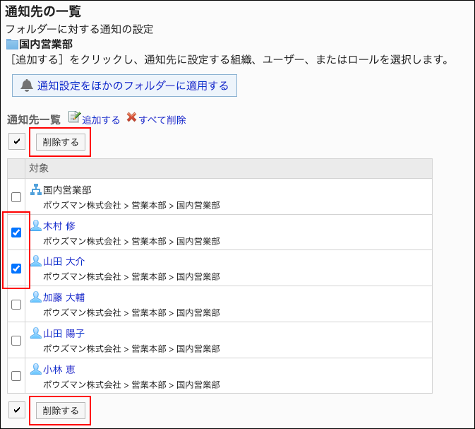 「通知設定の一括適用」画面で、通知設定を適用するフォルダーのチェックボックスを選択し、[適用する]をクリックします。
