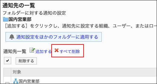 「通知先の一覧」画面で、[すべて削除]をクリックします。