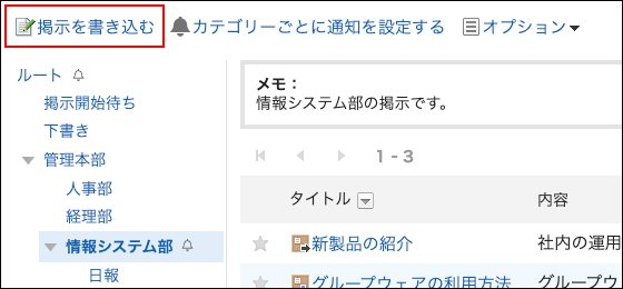 「掲示板」画面で、カテゴリーを選択し、[掲示を書き込む]をクリックします。
