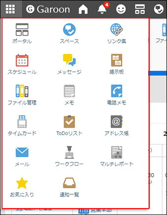 アプリケーションメニューの設定は、ヘッダーのアプリのアイコンをクリックして表示されるメニューにも適用されます。