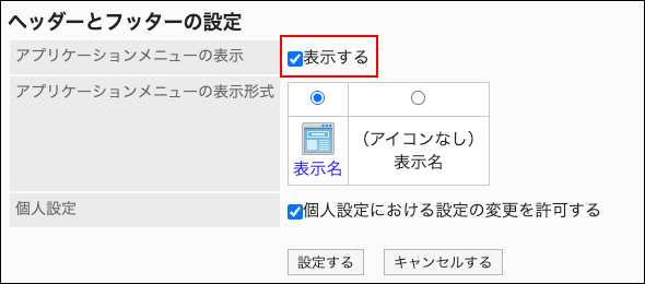 「ヘッダーとフッターの設定」画面の「アプリケーションメニュー」項目で、アプリケーションメニューを表示するかどうかを設定します。