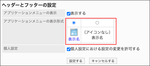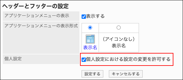 「ヘッダーとフッターの設定」画面の「個人設定」項目で、ユーザーにアプリケーションメニューの表示の変更を許可するかどうかを設定します。