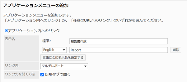 「アプリケーションメニューの追加」画面で、必要な項目を設定します。
