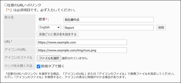 使用するアイコンがパソコンに保存されている場合は、その画像ファイルを指定します。ファイルを指定すると、Garoonの動作が遅くなる場合があります。 - リンク先を開く方法: