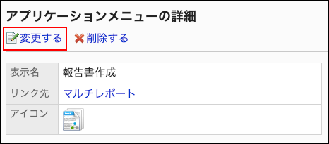 「アプリケーションメニューの詳細」画面で、[変更する]をクリックします。
