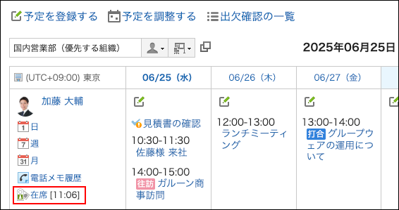 「スケジュール」画面で、自分または自分を代理人に設定しているユーザーの在席情報のステータスをクリックします。
