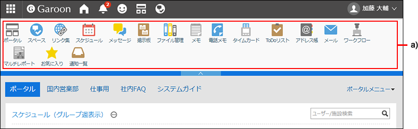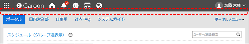 バージョン 6.17.0より前のGaroonをお使いの場合は、[画面]をクリックし、[ヘッダーとフッターの設定]をクリックします。 -