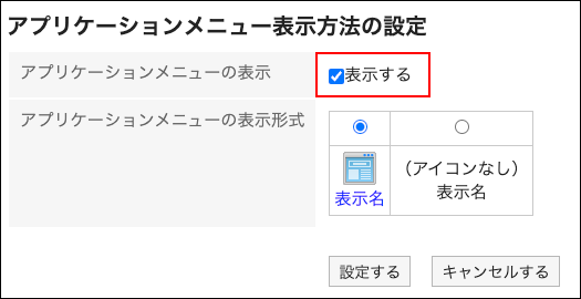 「表示する」のチェックボックスの選択を外すと、アプリケーションメニューを非表示にできます。