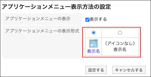 「アプリケーションメニューの表示形式」項目で、アプリケーションのアイコンを表示するかどうかを設定します。