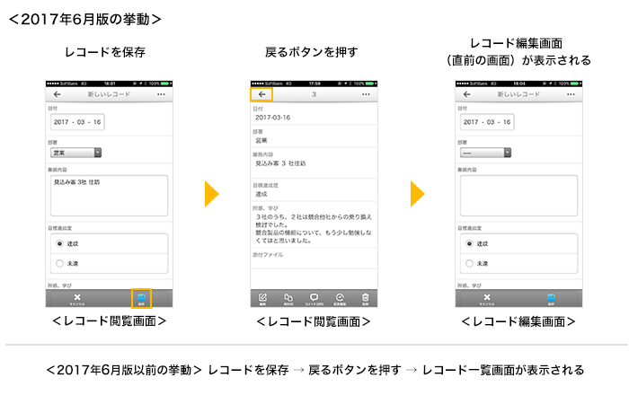 モバイルビュー、モバイルアプリで、レコード保存後の戻るボタンの挙動を変更しました。