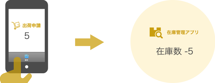 出荷申請アプリにモバイルから出納レコードを登録(編集)したときに、在庫管理アプリから在庫を増減するといったカスタマイズが可能です。