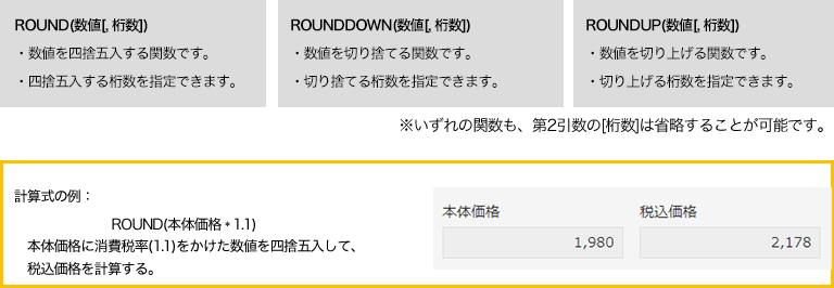 計算式に次の3つの関数が追加され、計算結果の四捨五入、切り捨て、切り上げができるようになりました。