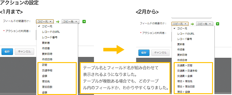 「ファイルから読み込む」や「アクションの設定」にもテーブル名が表示され、各フィールドが、どのテーブルにあるフィールドなのかが判別しやすくなり、設定を行いやすくなりました。