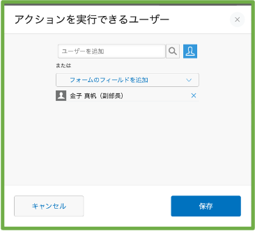 レコードの内容によってアクションを実行可能なユーザーを変更したい場合、実行可能なユーザーとしてフォーム内のユーザー/組織/グループフィールドを指定することで、例えばあるレコードを申請したユーザー自身がステータスを元に戻せるようなプロセスを設定することができます。