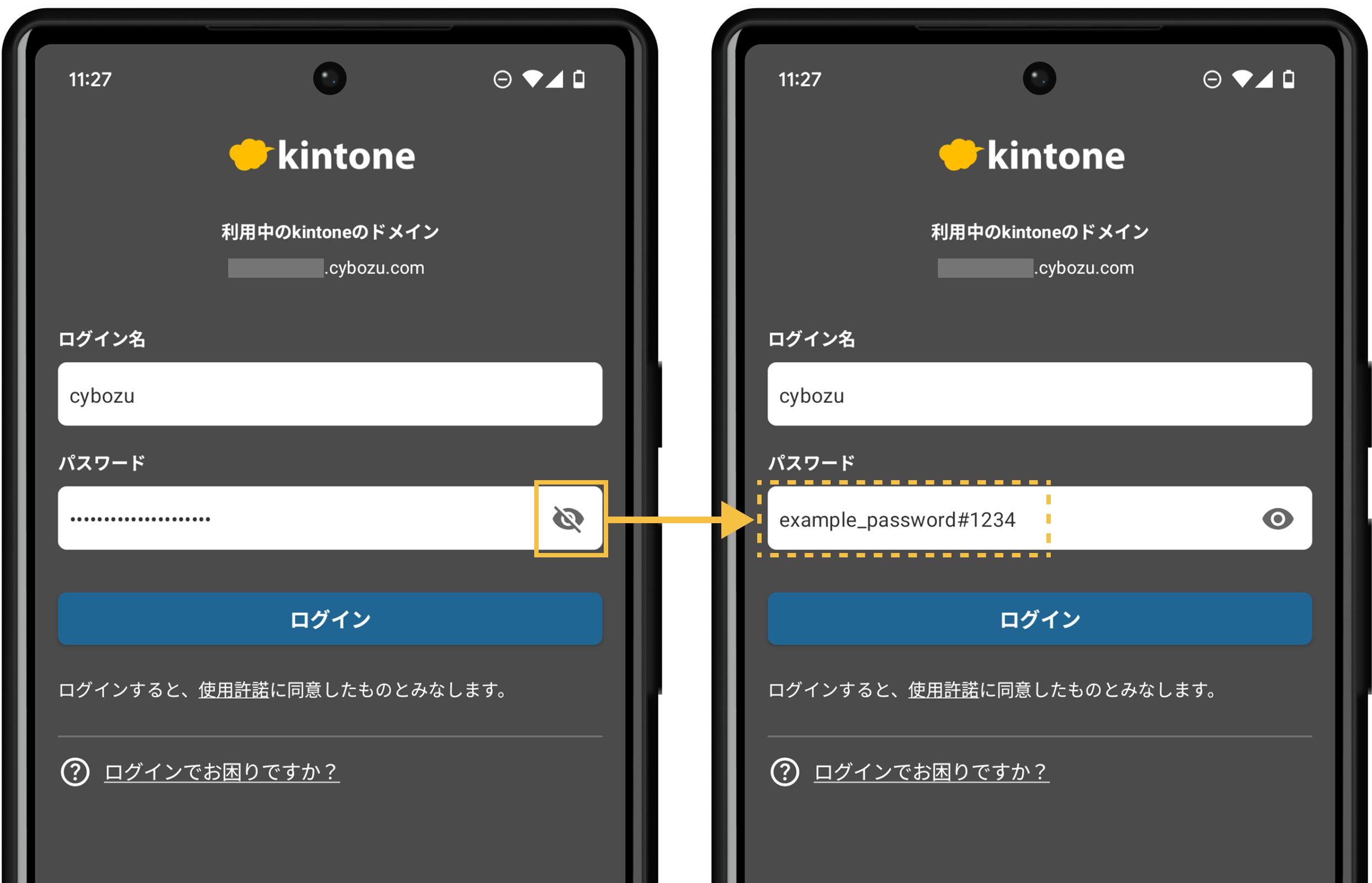 Android版 kintoneモバイルアプリにおいて、パスワード入力画面でパスワードを入力する際に、伏せ字表示を解除できるようになりました。これにより、第三者から画面を盗み見られる可能性が低い環境で、パスワードを表示して打ち間違いがないかを確認しながら入力できるようになります。また、ログインに失敗した場合も、最初から入力し直すことなく一部のみ修正して再試行しやすくなります。