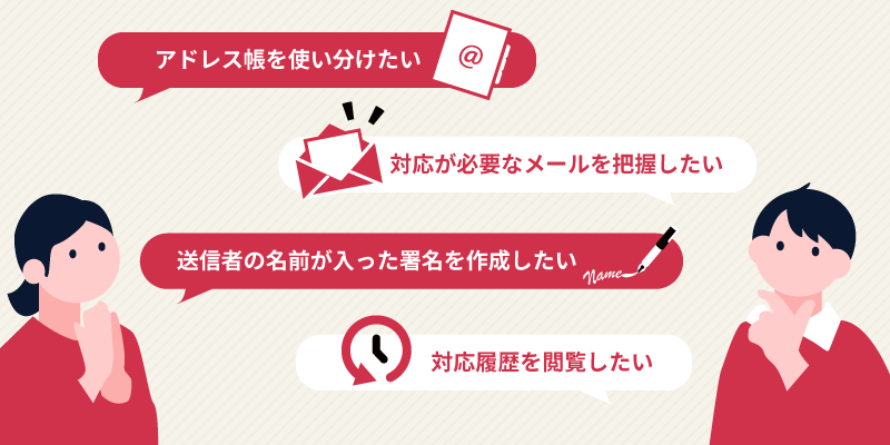 目的別ガイド 目的別ガイドでは、「やりたいこと」ベースで情報を探せます。 「アドレス帳を部署ごとで使い分けたい」「一覧画面でメールの優先度を把握したい」など、やりたいことができるかどうか、どの機能を使えばいいかがわからないときにぜひご活用ください。